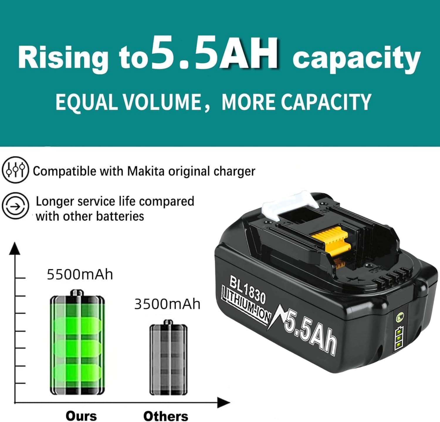 HomeEquipo ShopUncategorized4 Pack 5.5Ah/5500mAh Replacement Battery for Makita 18V Compatible with Makita 18V Battery BL1830 BL1830B BL1860B BL1840 BL1850 BL1860 BL1835 BL1845 194205-3 LXT-400 with LED Indicator