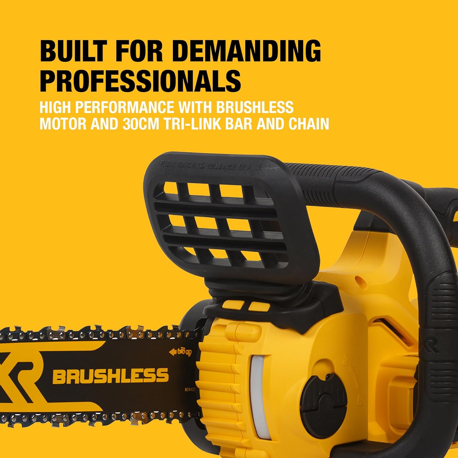 - POWERFUL AND EFFICIENT: The DEWALT 18V XR Brushless 30cm Compact Chainsaw delivers high performance with its brushless motor and 30cm TRI-LINK bar and chain, making it ideal for small to medium cutting tasks.